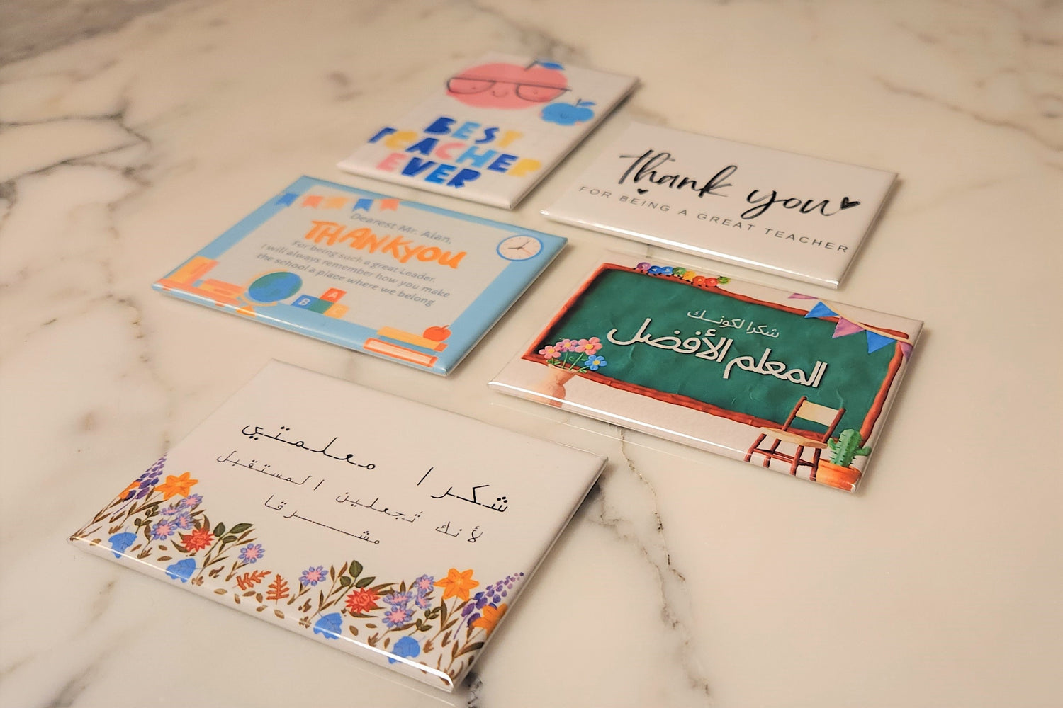 It's Teacher's Day! Show your appreciation to teachers on their day. Our fridge magnets with unique Arabic or English designs are the perfect way to say thanks to the teachers who inspire you. Order now for fast delivery in Qatar!